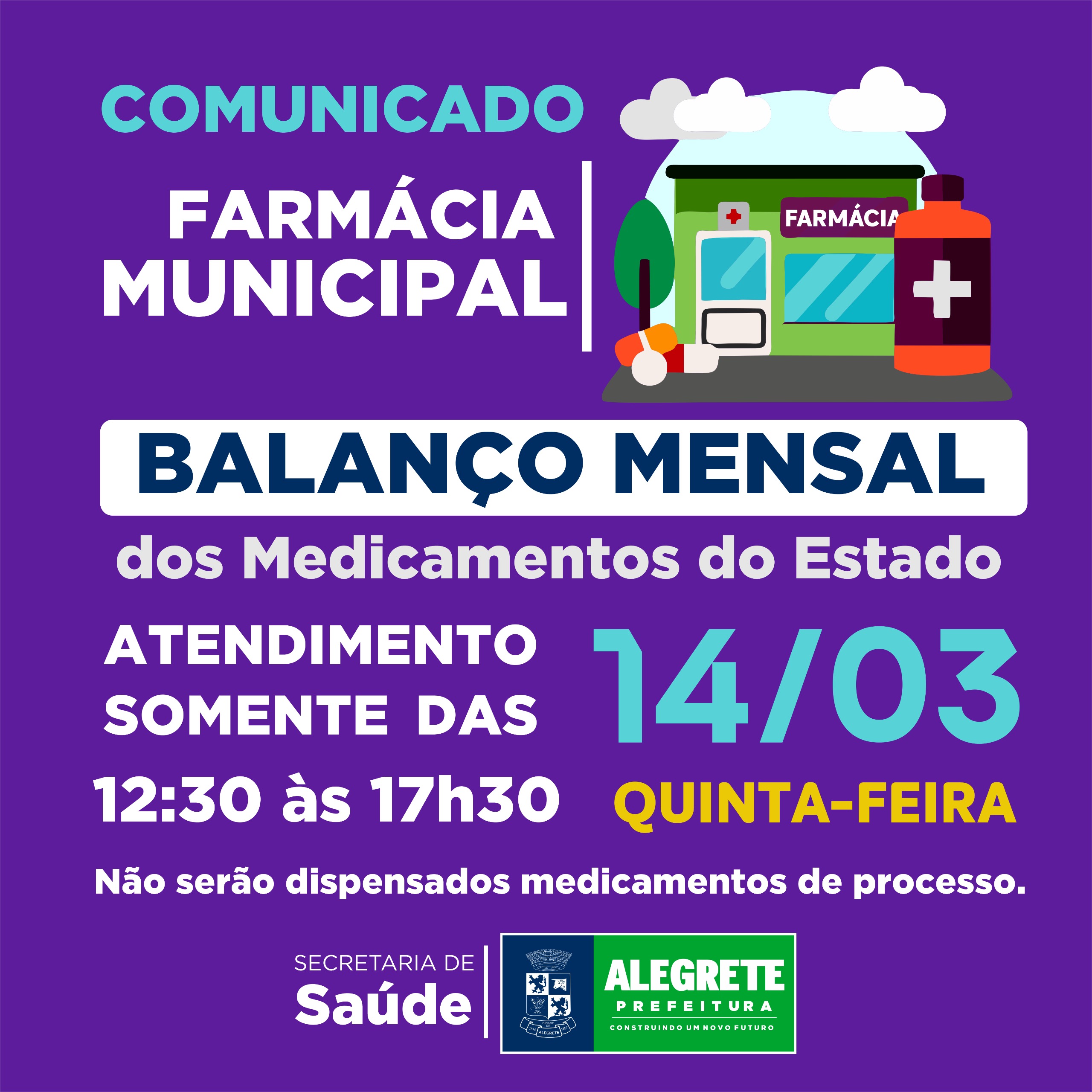 A Prefeitura de Alegrete, por meio da Secretaria de Saúde, comunica o não funcionamento da Farmácia Municipal na parte da manhã de quinta-feira, 14 de março, devido a o balanço de medicamentos do estado. Abrindo a partir das 12:30.